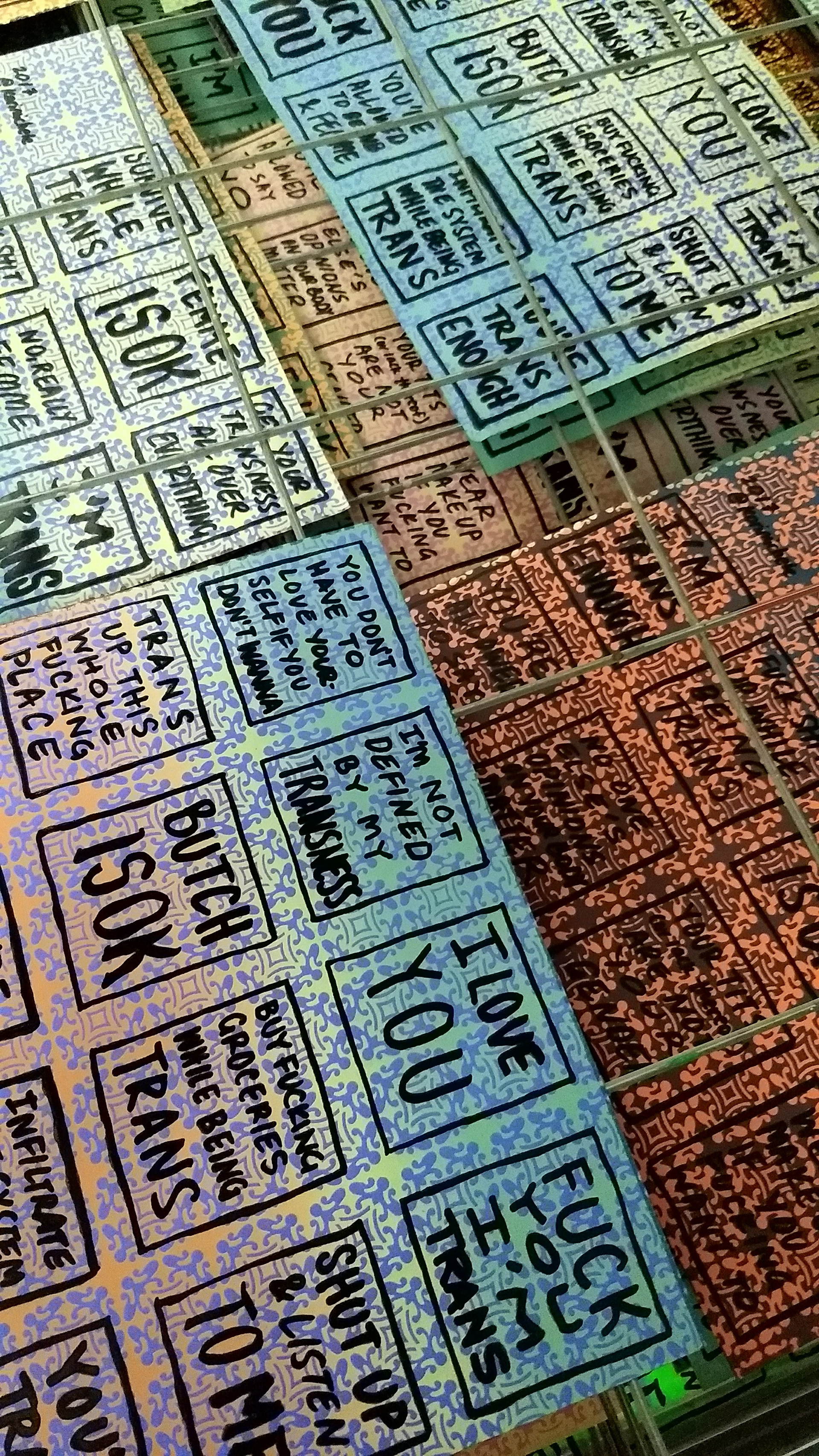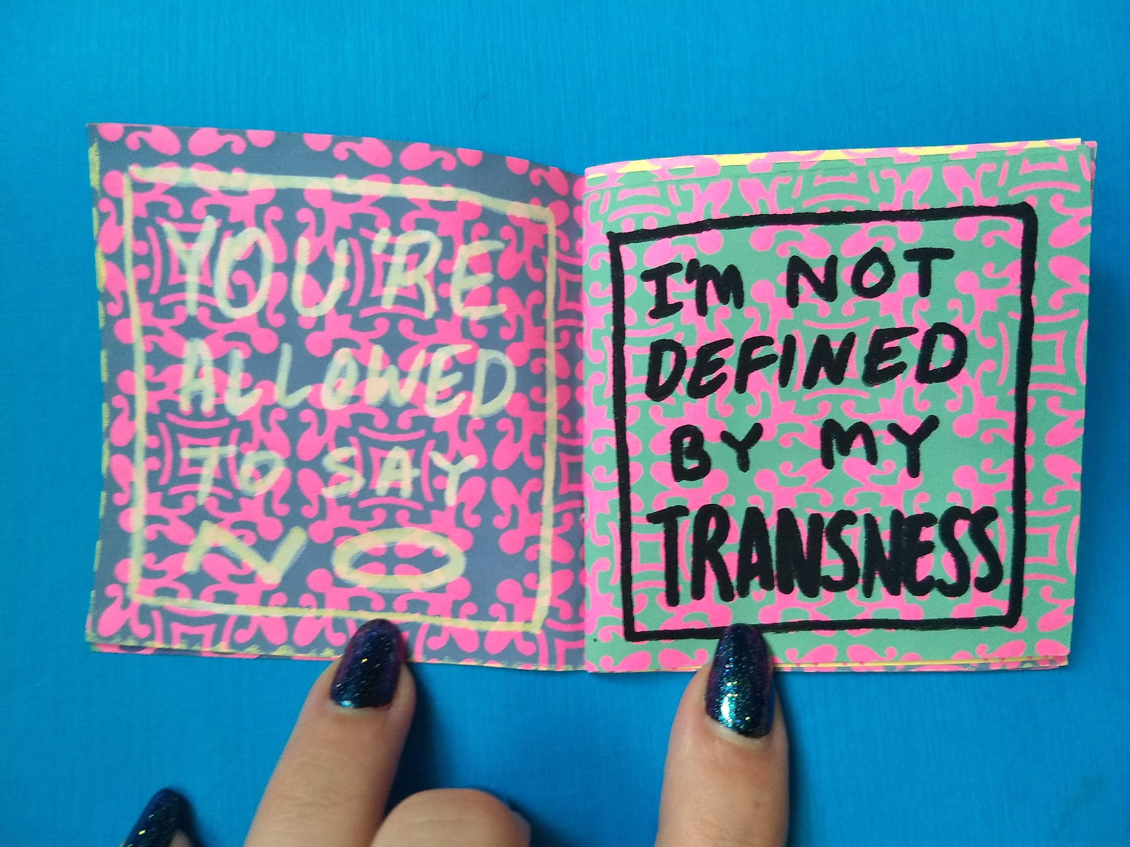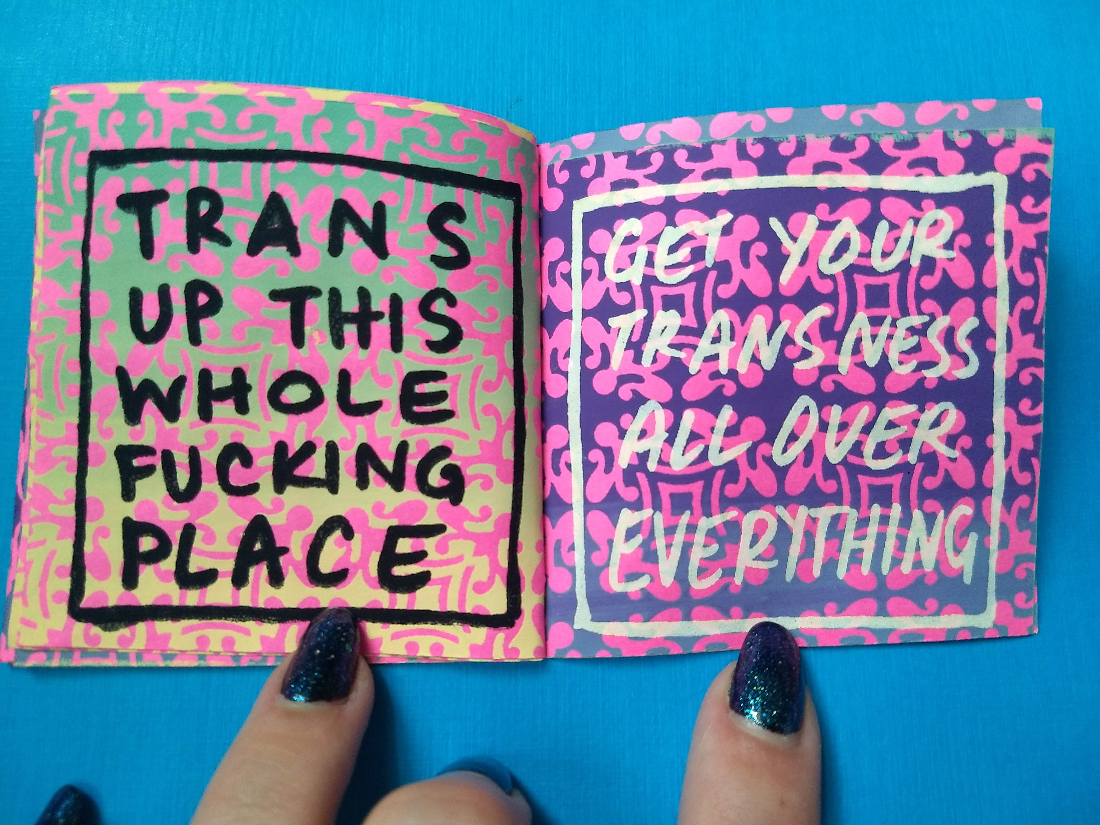 Fuck You, I'm Trans is a fully screenprinted zine, Printed in September 2017. The book consists of a series of angry, inspirational quotes related to transgender identity, on a variety of materials and in a variety of colors. 60 copies, print only.