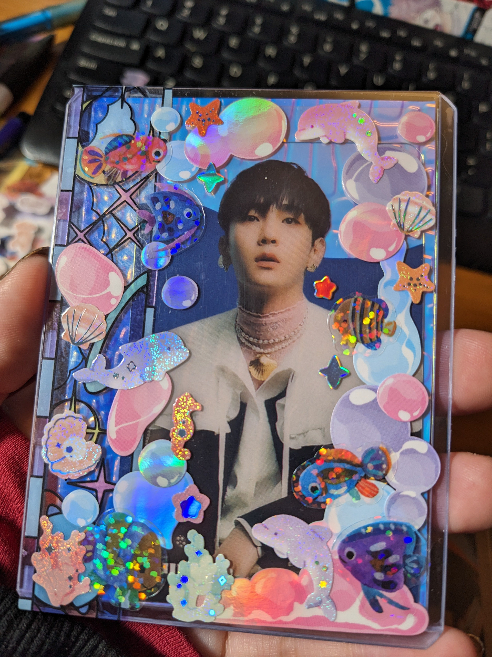 Decorated photo cards. Stickers on hard plastic toploaders.