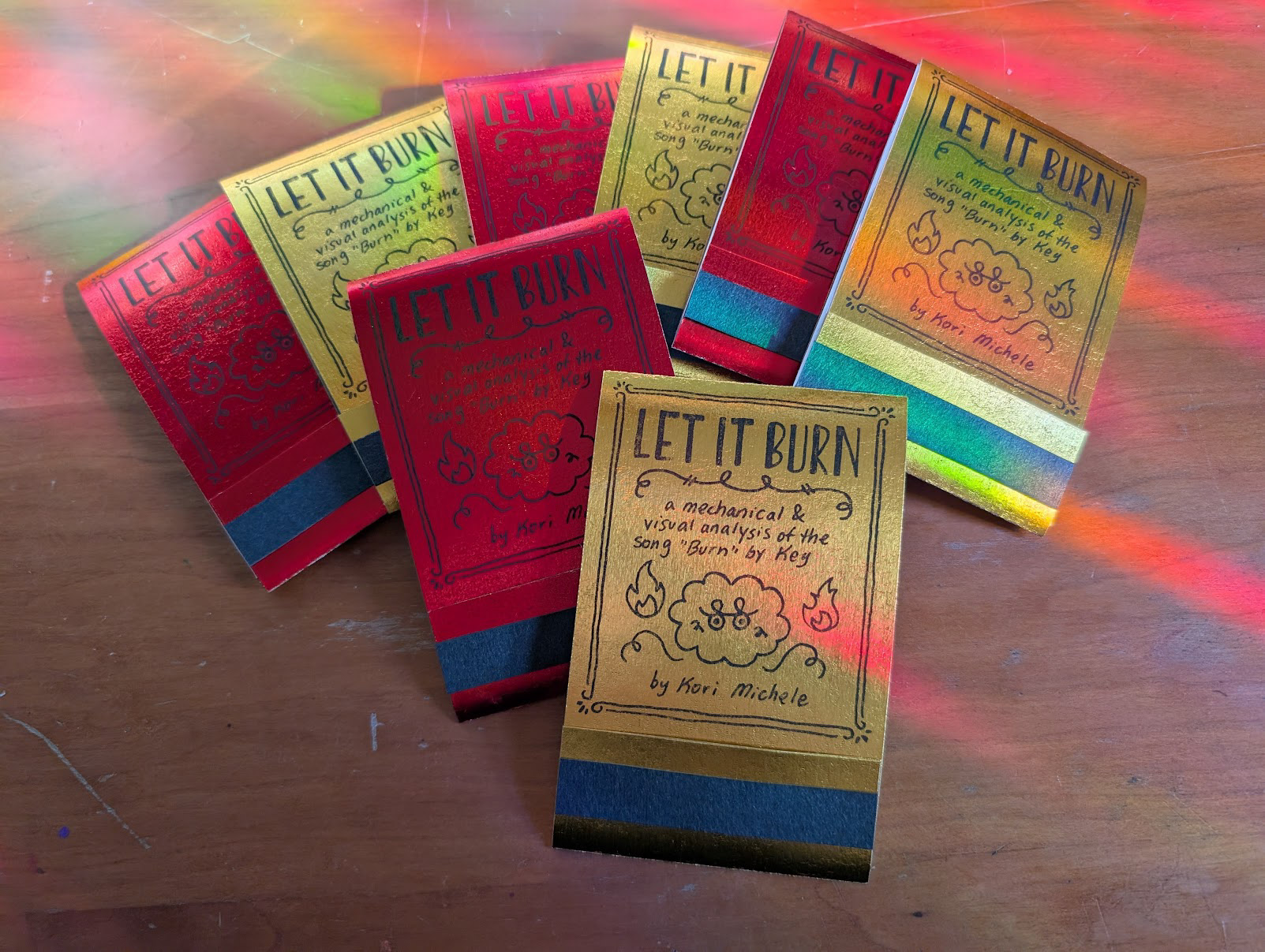 "Let it Burn" is an experimental format zine in which I express my obsessive love for the the song "Burn" by Key. It's a serpentine unfolding zine that emerges from a metallic package designed to look like a matchbook. As it opens, it reveals imagery, commentary, and lyrics corresponding to moments of the song (the intent is that you can unfold the zine as you listen to the song and read the commentary.)