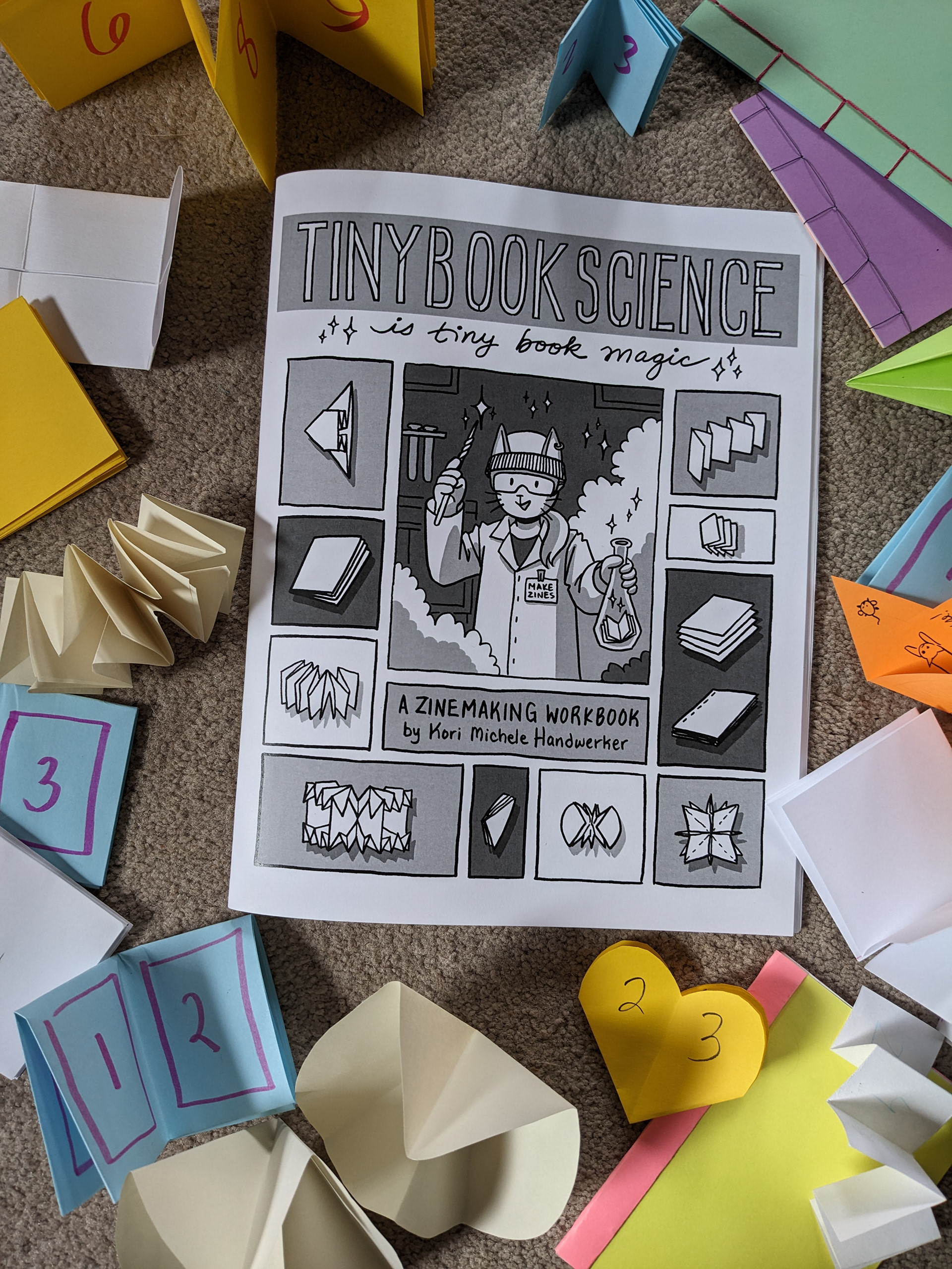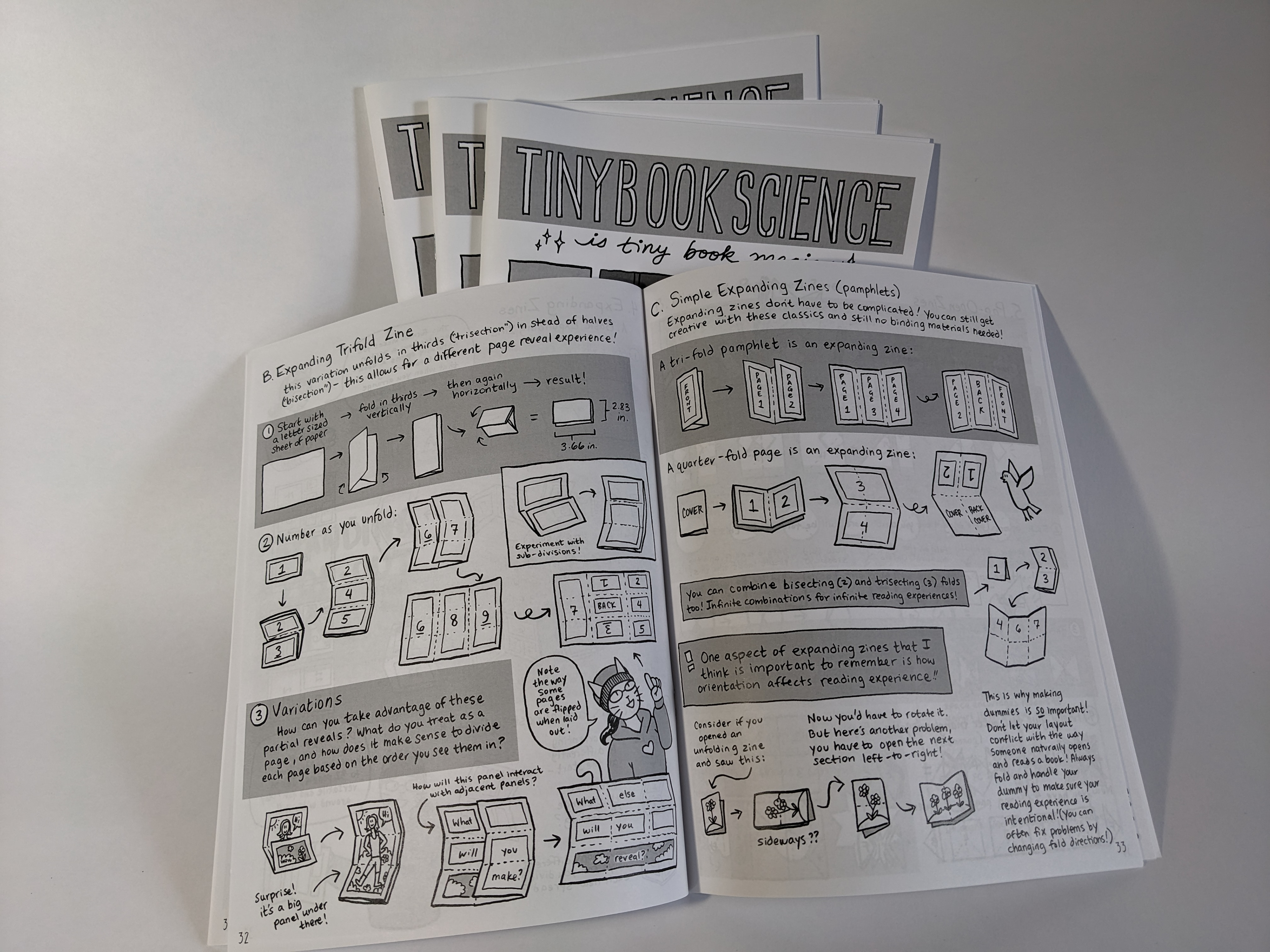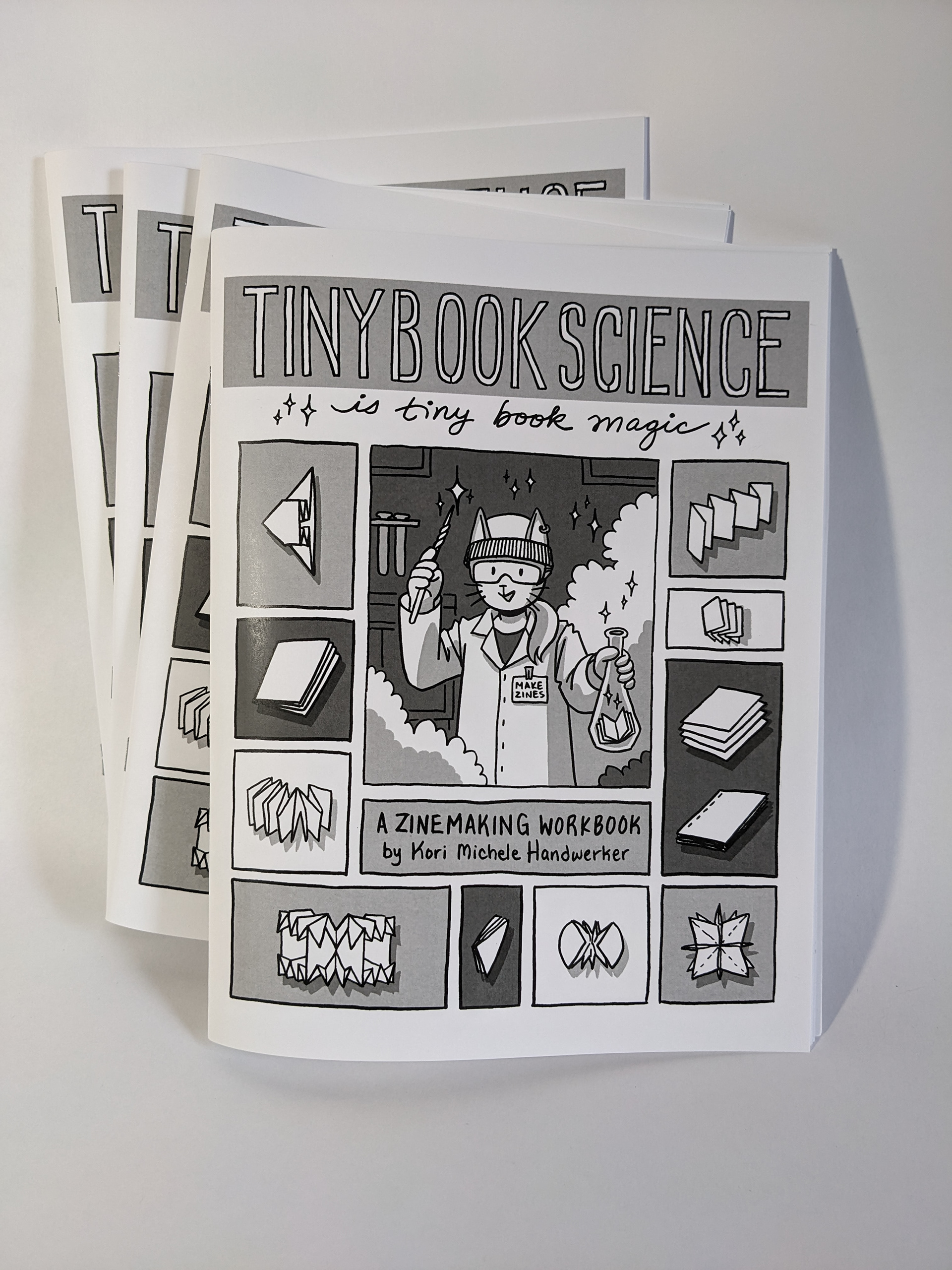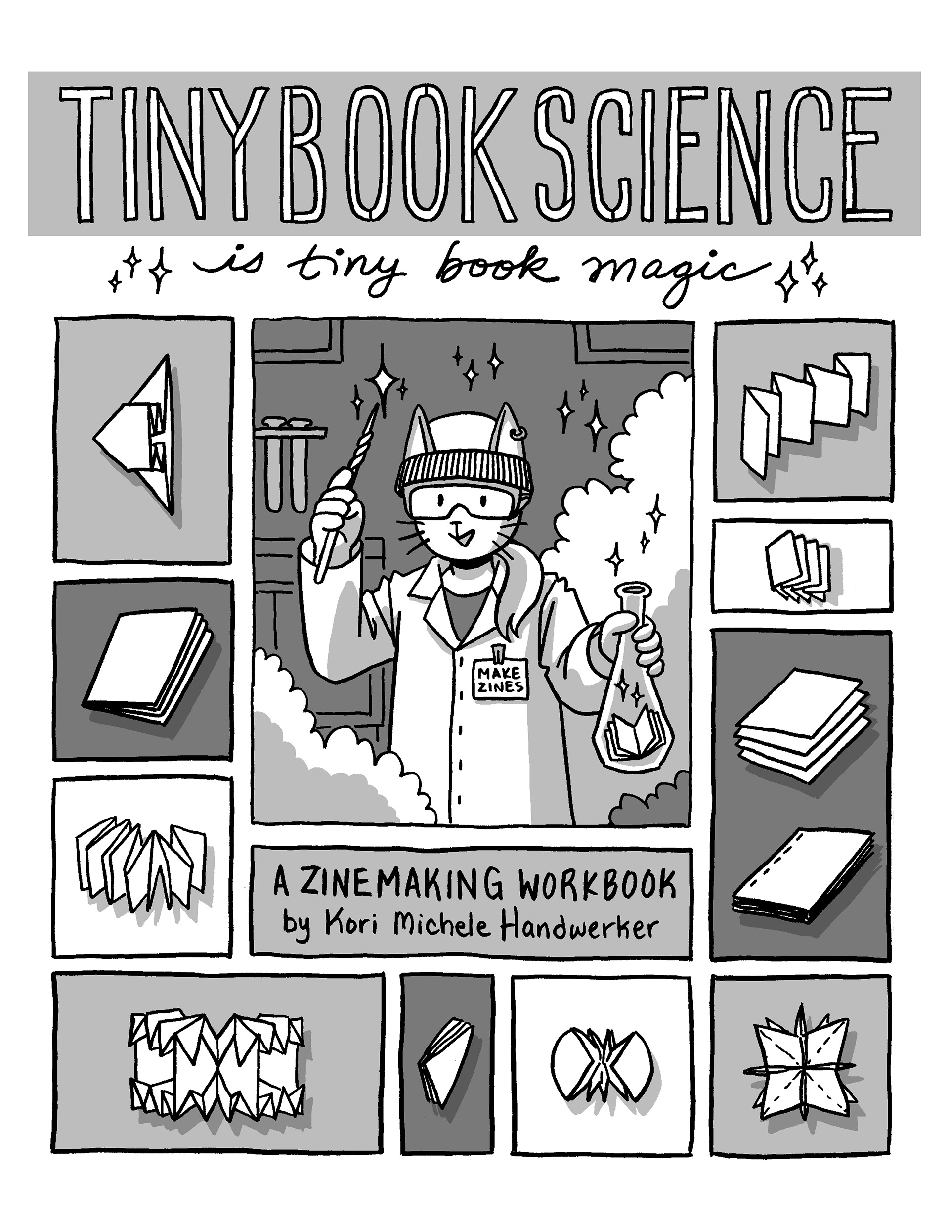Tiny Book Science is a 60 page Zine workbook for educators and zine-makers. Printed at letter-size for easy photocopying, it's packed full of worksheets and instructions to make 25 different formats of zines, with information to iterate, variate, and finish your tiny handmade books.